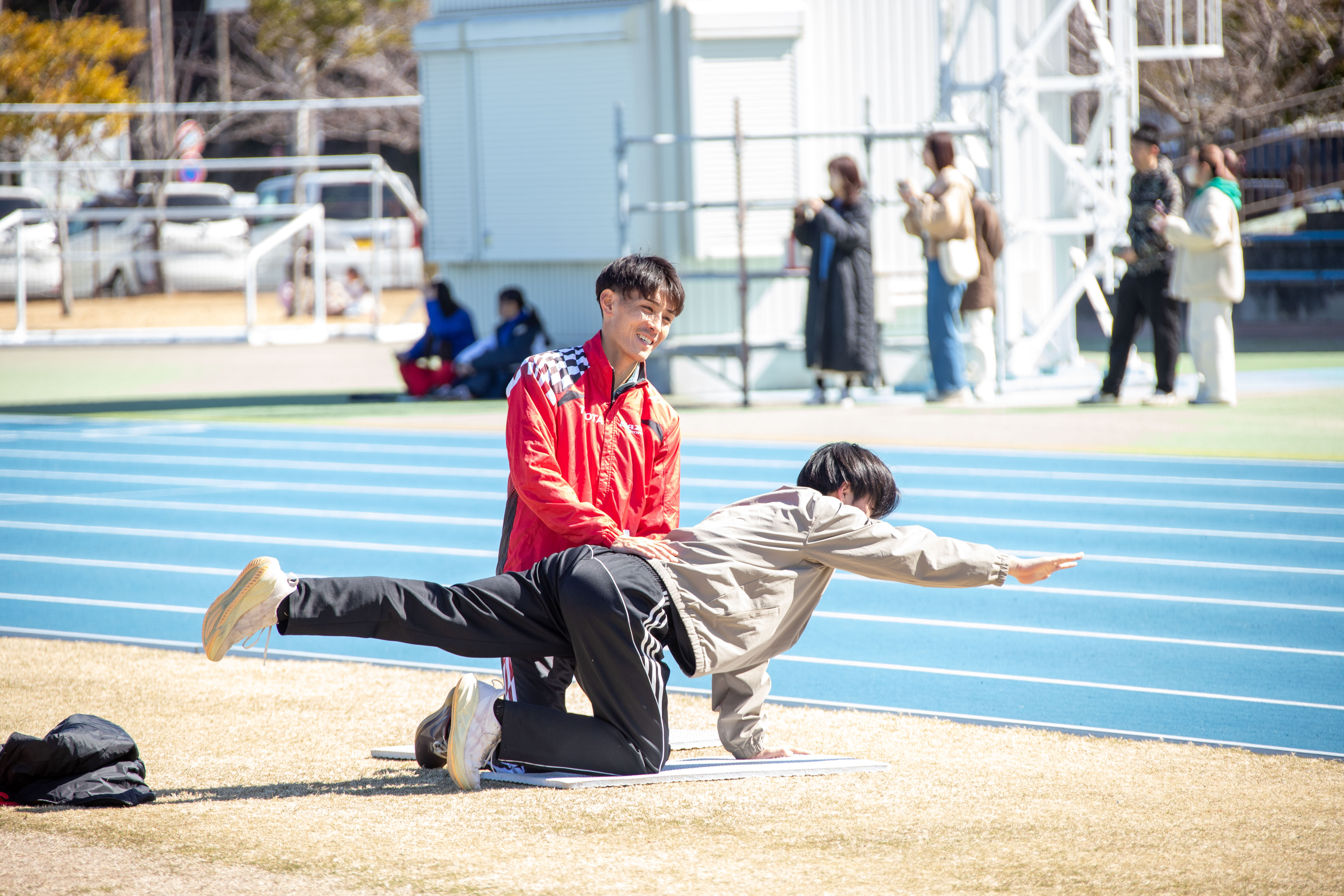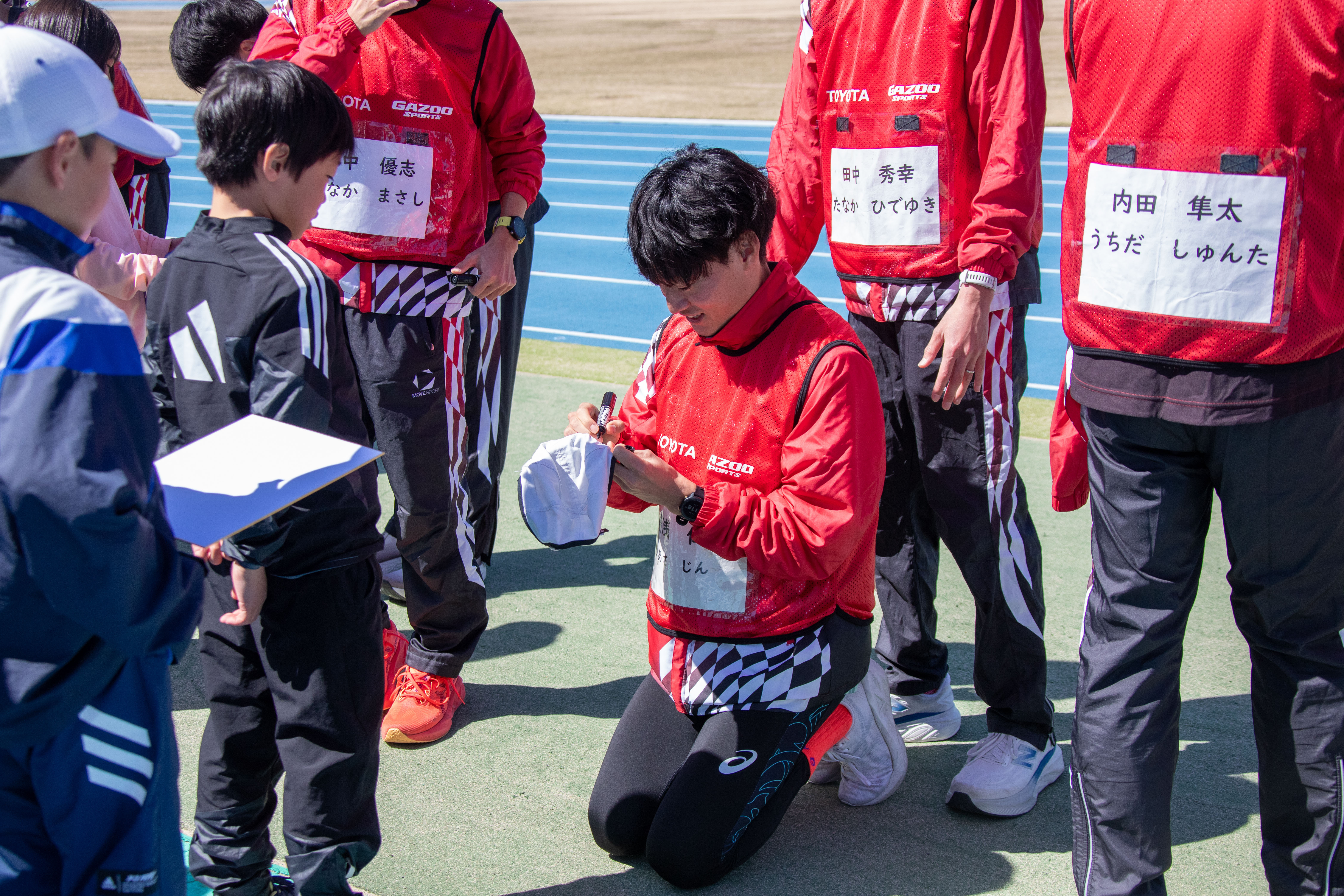 2026年3月14日(土)に田原市陸上競技協会主催による、トヨタ自動車ランニング教室が開催されました。小学生から高校生まで併せて約150名が参加し、各学年のレベルに応じた講習を行いました。タイムトライアルでは選手がペースメーカーとなり、子供たちの自己ベスト更新をサポート。最後には質問タイムやサイン会を行い、子供たちと触れ合う機会を通して、選手たちも刺激をもらうことができました。